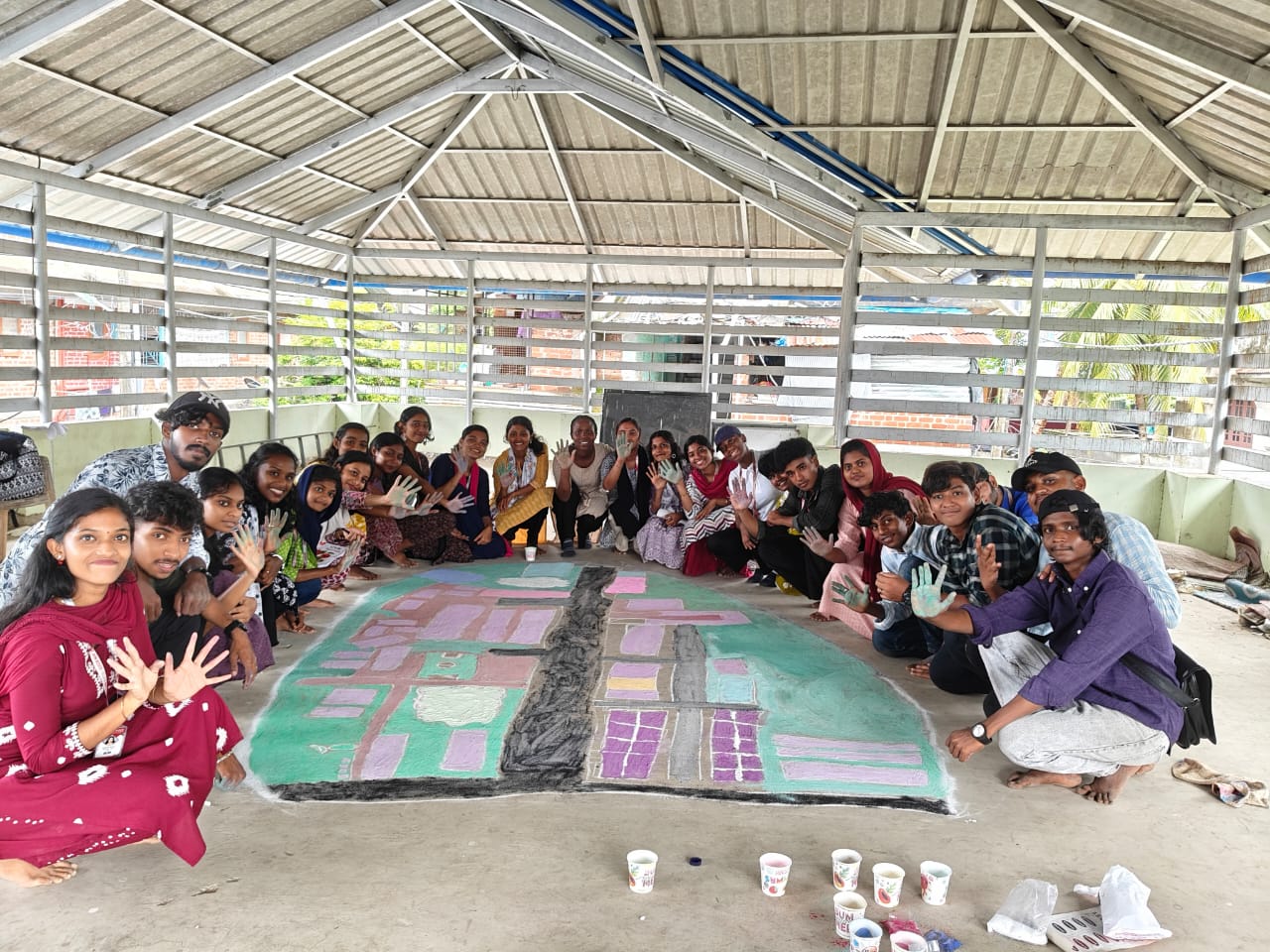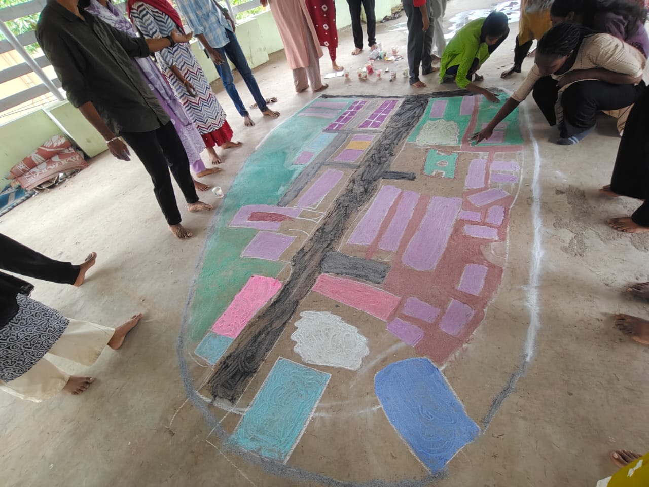 Students and community members working together on social and resource mapping exercises during the PRA orientation at Karimadom.